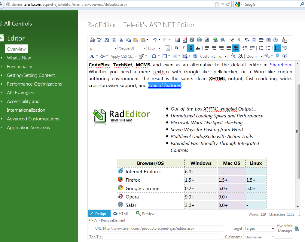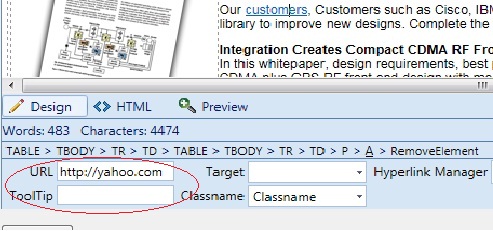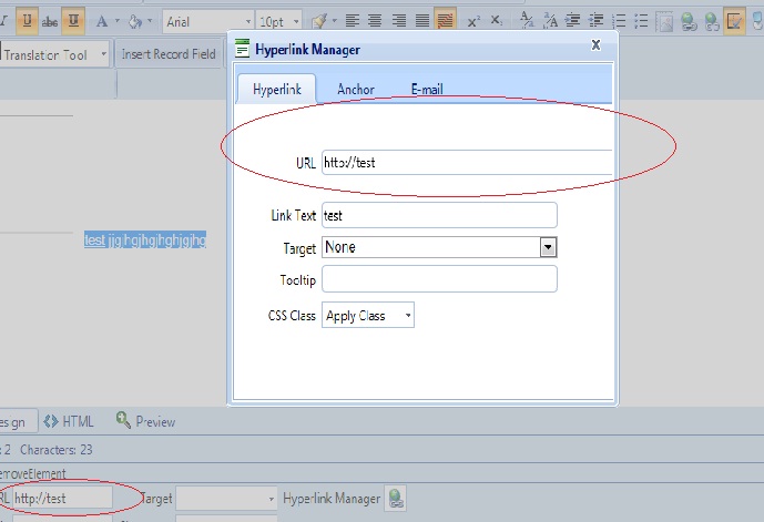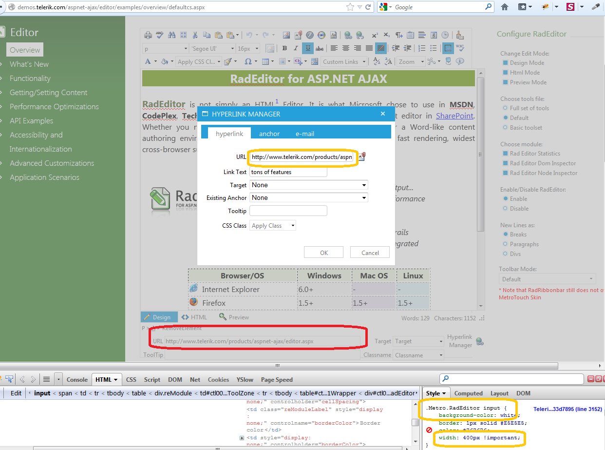 Hi, i am using RadEditor in .NET custom control. I've an hyperlink in the content area of the editor. Now, whenever the hyperlink is clicked the radeditor displays its properties in the bottom which can be edited. There are four properties namely: URL, Target, Tooltip and ClassName. Both URL and Tooltip have textbox as their inputs. Is there anyway to increase that textbox dimensions?