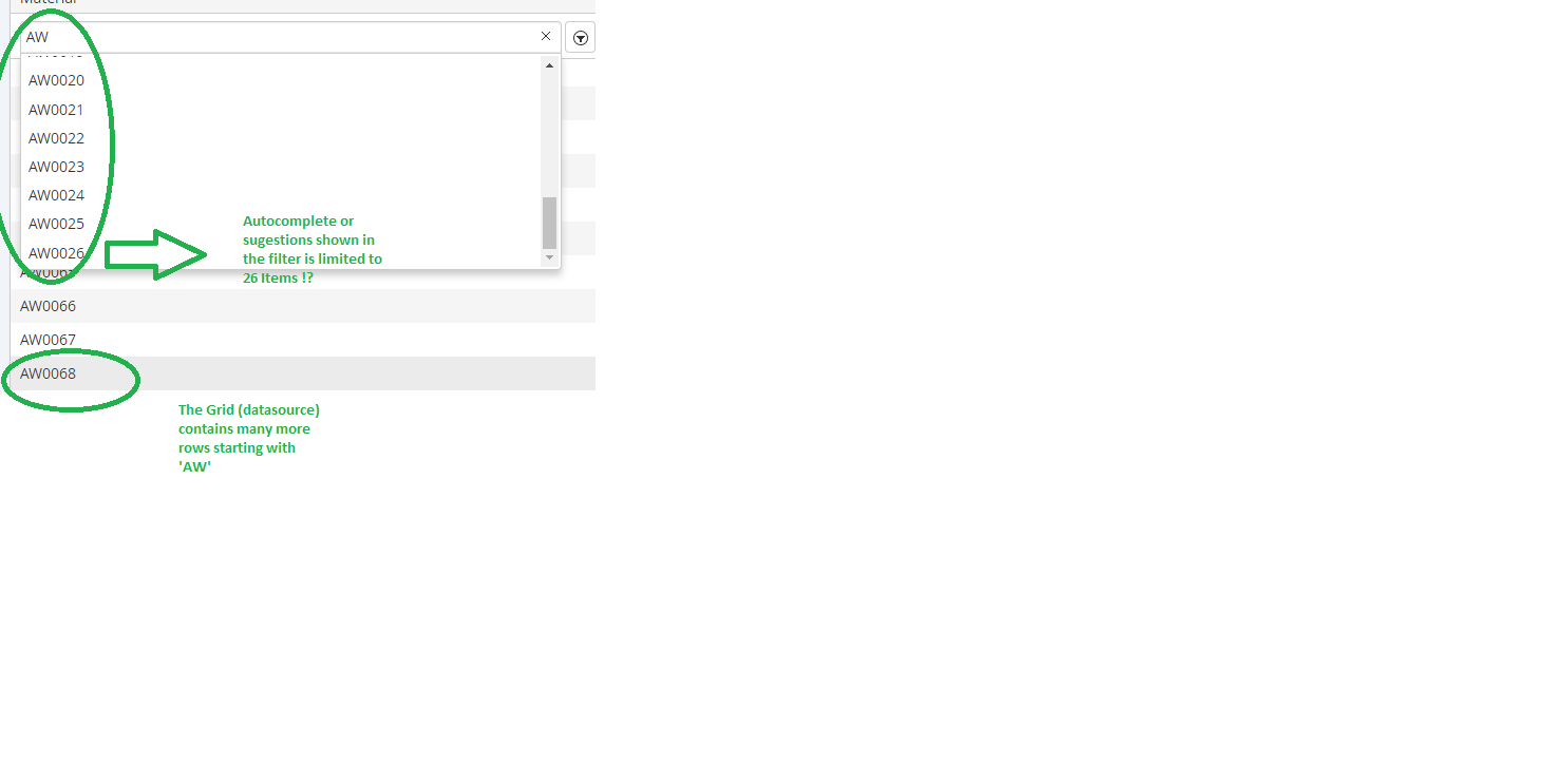 The Columnfilters-suggestions-dropwdown-list is only showing 26 suggestions starting with 'AW', while there are more than 100 rows starting with 'AW' in the grid.