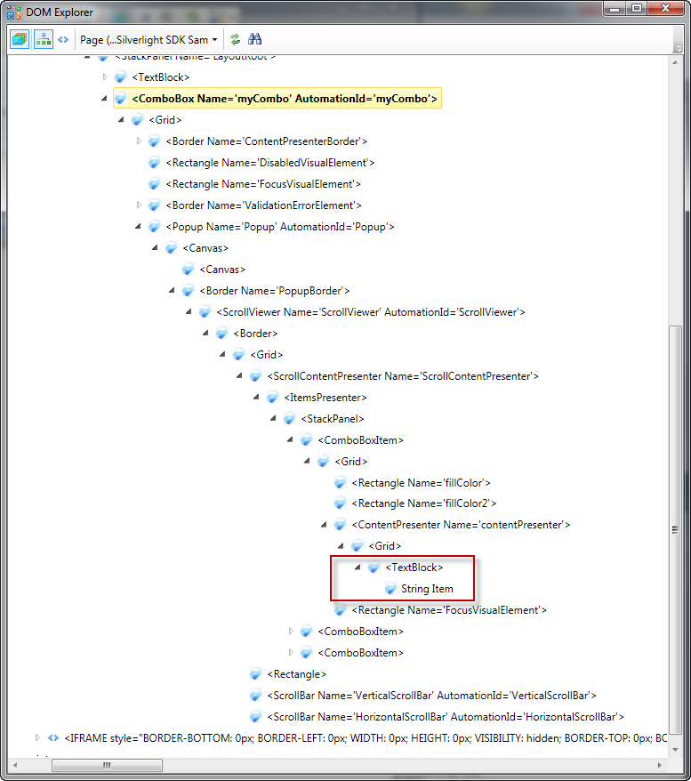 Thank you for the video demonstrating the failure. At a quick glance this does appear like a bug. For us to isolate it and fix it we need to be able to reproduce this problem locally. Is there anyway for us to access your test application directly? Or could you show us what the VisualTree looks like for that combobox? Attached is a sample of how a standard Silverlight Combobox looks in our DOM Explorer. Does yours have a similar structure?