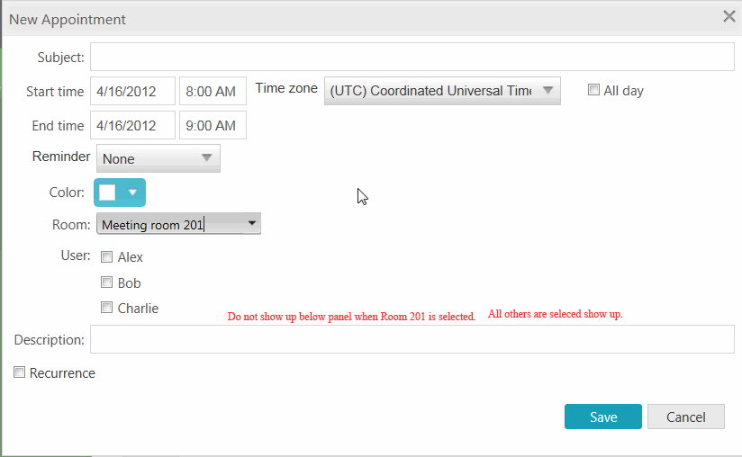 we use radscheduler advancedtemplate. The requirement Do NOT show description panel when select resource rooms 201. When select other resource Rooms will show up that description panel.