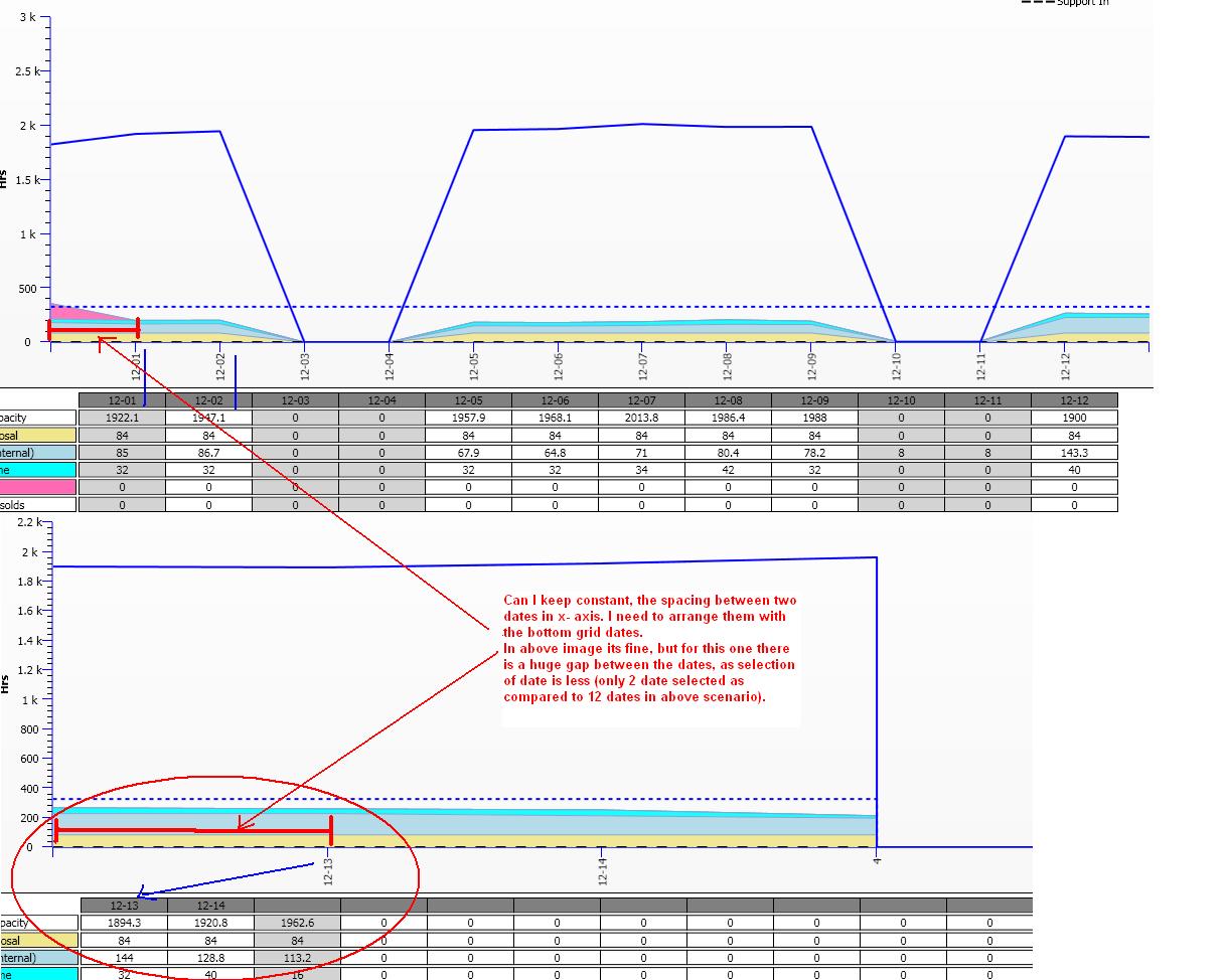 Now when user select the less number of dates say 2 or 6, the gap between the two dates on x-axis increases, as it has more space available, which is now not alligned with the grid.