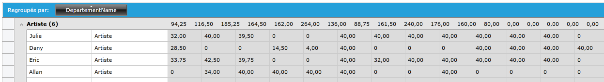 sumFunction = new SumFunction();sumFunction.SourceField = radTimeLineGridView.Columns[i].UniqueName;sumFunction.ResultFormatString = "{0:f2}";radTimeLineGridView.Columns[i].AggregateFunctions.Add(sumFunction);When I group by the Department column, the sum of each column is shown in the group header, but it's not following the columns layout. Please see attached image.