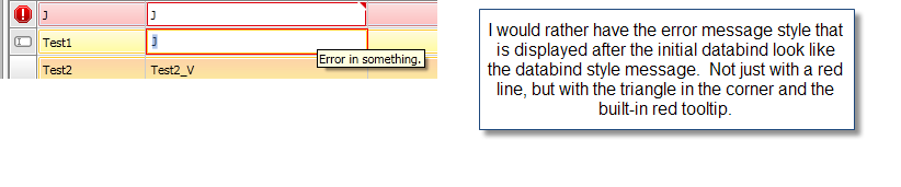 When the RadGridView is populated with data that already fails the validation rules at the time the data is binded, the grid displays what I consider a nicer looking error template that contains a red triangle in the corner of the cell and highlights the cell in red. However, when the user edits a cell/property value to a value that is invalid according to the property rules they see another style of error notification that is a simple red box around the cell without "niceness" of the other error. See attached files for the comparison.