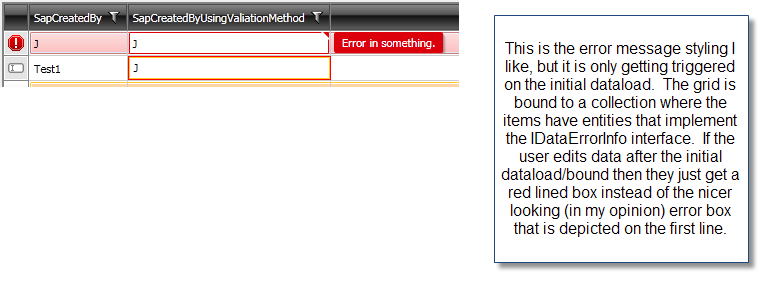 I'm having a problem with the display of error messages on validation on a RadGridView. I use property level validation implementing the IDataErrorInfo interface on my entity classes and the RadGridView correctly reconnizes when there are errors in the entity properties, however it rendered the errors that are present at databinding and the errors that occur due to user editing quite differently.