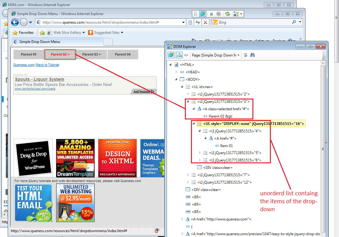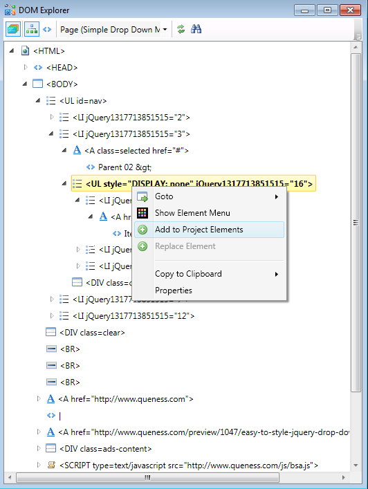 We have 4 jquery drop-downs. When we bring up the DOM Explorer and we examine them we see that the items for each drop-down are defined in a UL (HTML Unordered List) (see screenshot 1). Now you can add the Unorder List item to the Elements Repository (screenshot 2).