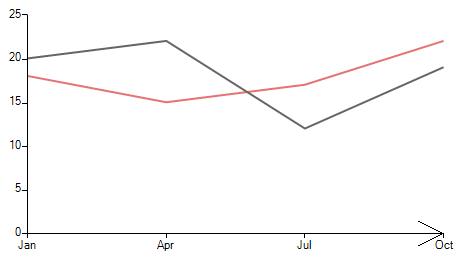 public RadForm1(){ InitializeComponent(); this.radChartView1.CreateRenderer += new ChartViewCreateRendererEventHandler(radChartView1_CreateRenderer); LineSeries lineSeries = new LineSeries(); lineSeries.DataPoints.Add(new CategoricalDataPoint(20, "Jan")); lineSeries.DataPoints.Add(new CategoricalDataPoint(22, "Apr")); lineSeries.DataPoints.Add(new CategoricalDataPoint(12, "Jul")); lineSeries.DataPoints.Add(new CategoricalDataPoint(19, "Oct")); this.radChartView1.Series.Add(lineSeries); LineSeries lineSeries2 = new LineSeries(); lineSeries2.DataPoints.Add(new CategoricalDataPoint(18, "Jan")); lineSeries2.DataPoints.Add(new CategoricalDataPoint(15, "Apr")); lineSeries2.DataPoints.Add(new CategoricalDataPoint(17, "Jul")); lineSeries2.DataPoints.Add(new CategoricalDataPoint(22, "Oct")); this.radChartView1.Series.Add(lineSeries2);}private void radChartView1_CreateRenderer(object sender, ChartViewCreateRendererEventArgs e){ e.Renderer = new CustomCartesianRenderer(e.Area as CartesianArea);}public class CustomCartesianAxisDrawPart : CartesianAxisDrawPart{ public CustomCartesianAxisDrawPart(CartesianAxis axis, IChartRenderer renderer) : base(axis, renderer) { } int arrowOffset = 50; protected override RectangleF GetClipRect() { RectangleF rect = base.GetClipRect(); if (rect.Height < rect.Y) { return new RectangleF(rect.X, rect.Y - arrowOffset, rect.Width, rect.Height * 4); } return rect; } protected override void DrawAxis() { AxisModel model = this.Element.Model; RadRect slot = model.LayoutSlot; float x1, x2, y1, y2; // update line points if (model.Type == AxisType.First) { x1 = this.ViewportOffsetX + (float)slot.X; x2 = this.ViewportOffsetX + (float)slot.Right; if (model.VerticalLocation == AxisVerticalLocation.Bottom) { y1 = this.ViewportOffsetY + (float)slot.Y; y2 = this.ViewportOffsetY + (float)slot.Y; } else { y1 = this.ViewportOffsetY + (float)slot.Bottom; y2 = this.ViewportOffsetY + (float)slot.Bottom; } } else { y1 = this.ViewportOffsetY + (float)slot.Y; y2 = this.ViewportOffsetY + (float)slot.Bottom; if (model.HorizontalLocation == AxisHorizontalLocation.Left) { x1 = this.ViewportOffsetX + (float)slot.Right; x2 = this.ViewportOffsetX + (float)slot.Right; } else { x1 = this.ViewportOffsetX + (float)slot.X; x2 = this.ViewportOffsetX + (float)slot.X; } } CartesianRenderer renderer = (CartesianRenderer)this.Renderer; RadGdiGraphics radGraphics = new RadGdiGraphics(renderer.Graphics); RectangleF rect = ChartRenderer.ToRectangleF(model.LayoutSlot); SizeF offset = ((CartesianRenderer)this.Renderer).GetAxisOffset((CartesianAxis)this.Element); GraphicsPath borderPath = new GraphicsPath(); borderPath.AddLine(x1 + offset.Width, y1 + offset.Height, x2 + offset.Width, y2 + offset.Height); if (y1 == y2)//the horizontal axis { int arrowOffset = 50; radGraphics.DrawLine(Color.Black, x2 + offset.Width - arrowOffset / 2, y2 + offset.Height + arrowOffset / 4, x2 + offset.Width, y1 + offset.Height); radGraphics.DrawLine(Color.Black, x2, y1, x2 - arrowOffset / 2, y2 - arrowOffset / 4); } BorderPrimitiveImpl border = new BorderPrimitiveImpl(this.Element, null); border.PaintBorder(radGraphics, null, borderPath, rect); }}public class CustomCartesianRenderer : CartesianRenderer{ public CustomCartesianRenderer(CartesianArea area) : base(area) { } protected override void InitializeAxes() { // base.InitializeAxes(); IEnumerator<Axis> axisEnumerator = this.Area.Axes.GetRenderEnumerator(); while (axisEnumerator.MoveNext()) { this.DrawParts.Add(new CustomCartesianAxisDrawPart((CartesianAxis)axisEnumerator.Current, this)); this.DrawParts.Add(new AxisLabelDrawPart(axisEnumerator.Current, this)); this.DrawParts.Add(new AxisTitleDrawPart(axisEnumerator.Current, this)); } }}Off topic, note that most of the forum threads are reviewed by Telerik representatives and sometimes we address the questions asked by our customers in the forums as well. However, a post in the forum doesn't guarantee you a response from the Telerik support team. Moreover, threads are handled according to license and time of posting, so if it is an urgent problem, we suggest you use a support ticket, which would be handled before a forum thread