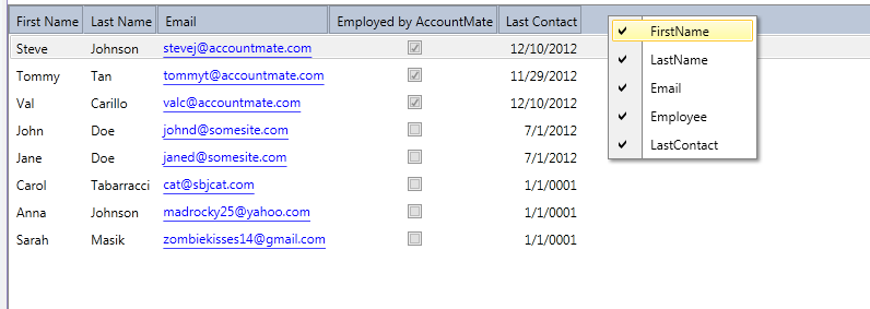 public class Person{ [Display(ShortName = "First Name")] public String FirstName { get; set; } [Display(ShortName = "Last Name")] public String LastName { get; set; } [Display(AutoGenerateFilter = false, AutoGenerateField = false)] public String FullName { get; set; } [Display(ShortName = "Email")] public String Email { get; set; } [Display(ShortName = "Employed by AccountMate")] public bool Employee { get; set; } [Display(ShortName = "Last Contact")] public DateTime LastContact { get; set; } public Person(String fn, String ln, String em, bool empl, DateTime lc) { FirstName = fn; LastName = ln; Email = em; Employee = empl; LastContact = lc; }}0