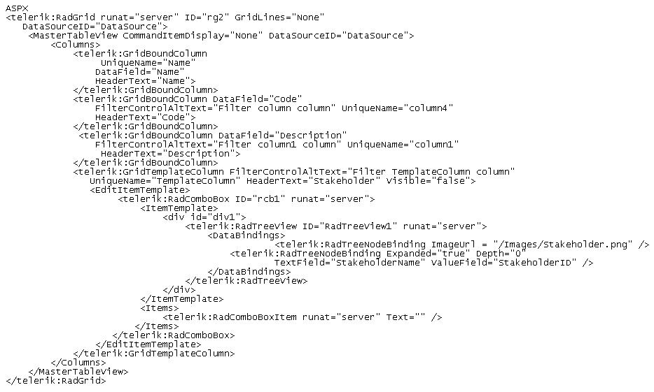I have a RadTreeView nested in a RadComboBox which is in a RadGrid(GridTemplateColumn). How can I get the selected node value thru client side script? I cant manage to set the text for the combobox after selecting the node value from the treeview. I'd appreciate your help. Thanks in advance!