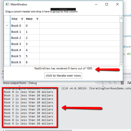 // this is to get the currently rendered rowsvar rows = this.myGridView.ChildrenOfType<GridViewRow>();// myGridView.Items will get you all the data itemsforeach (var item in myGridView.Items){ var book = item as Book; // now you can check the DataItem for a particular value if (book?.Price < 10) { Debug.WriteLine($"{book.Title} is less than 10 dollars"); }}// To confirm the countsOutputTextBlock.Text = $"RadGridView has rendered {rows.Count()} items out of {myGridView.Items.ItemCount}";Lastly, I do not see if you were looking for a C# or VB answer, but our documentation has both for code snippets (here's an example). If you do find something that is C#, like my example, you can quickly convert it using our online Code Converter.
