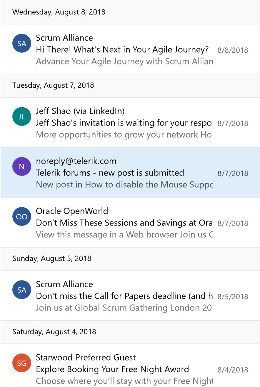 private class MailListVisualItem : SimpleListViewVisualItem { private LightVisualElement element1; private LightVisualElement element2; private StackLayoutPanel layout; protected override void CreateChildElements() { base.CreateChildElements(); this.layout = new StackLayoutPanel(); this.layout.EqualChildrenWidth = false; this.layout.Margin = new Padding(20, 0, 0, 0); this.element1 = new LightVisualElement(); element1.TextAlignment = ContentAlignment.TopLeft; element1.Size = new Size(260, 0); element1.MinSize = new Size(260, 0); element1.NotifyParentOnMouseInput = true; element1.ShouldHandleMouseInput = false; this.layout.Children.Add(this.element1); this.element2 = new LightVisualElement(); element2.TextAlignment = ContentAlignment.TopLeft; element2.Size = new Size(80, 0); element2.NotifyParentOnMouseInput = true; element2.ShouldHandleMouseInput = false; this.layout.Children.Add(this.element2); this.Children.Add(this.layout); } protected override void SynchronizeProperties() { base.SynchronizeProperties(); if (this.Data.GetType() != typeof(ListViewDataItemGroup)) { this.Text = ""; var bodyText = this.Data["BodyText"] == null ? "" : this.Data["BodyText"].ToString().Replace(System.Environment.NewLine, " "); this.element1.Text = "<html><span>" + "<span style=\"font-size:12\">" + this.Data["From"] + "</span>" + "<br><span style=\"color:#13224D;font-family:Segoe UI;font-size:10\">" + this.Data["Subject"] + "</span>" + "<br><span style=\"color:#13224D;font-family:Segoe UI;font-size:10\">" + bodyText + "</span></span></html>"; this.element2.Text = "<html><span> </span>" + "<br><span style =\"color:#13224D;font-family:Segoe UI;font-size:10\">" + this.Data["ReceivedTime"] + "</span></html>"; this.TextAlignment = ContentAlignment.TopLeft; } } protected override Type ThemeEffectiveType { get { return typeof(SimpleListViewVisualItem); } } }