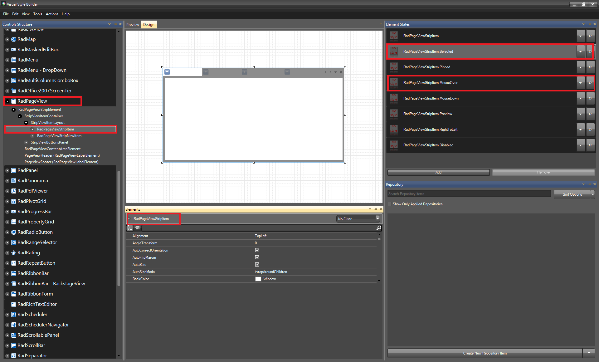 2. Change the BackColorProperty, DrawFillProperty and NumberOfColorsProperty properties of the RadPageViewStripItem (see attached picture).