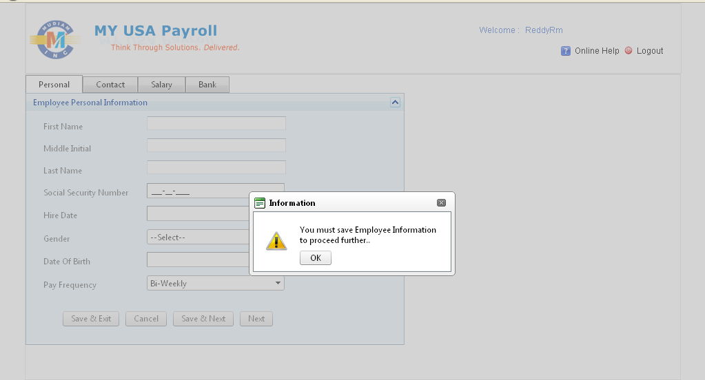 <telerik:RadWindowManager ID="RadWindowManager1" runat="server" VisibleOnPageLoad="false"> <Shortcuts> <telerik:WindowShortcut CommandName="CloseAll" Shortcut="Esc" /> </Shortcuts> </telerik:RadWindowManager> <telerik:RadAjaxManager runat="server" ID="RadAjaxManager1"> <AjaxSettings> <telerik:AjaxSetting AjaxControlID="rdmpPersonal"> <UpdatedControls> <telerik:AjaxUpdatedControl ControlID="rdtabEmployee" /> <telerik:AjaxUpdatedControl ControlID="rdmpPersonal" /> </UpdatedControls> </telerik:AjaxSetting> <telerik:AjaxSetting AjaxControlID="rdtabEmployee"> <UpdatedControls> <telerik:AjaxUpdatedControl ControlID="rdtabEmployee" /> <telerik:AjaxUpdatedControl ControlID="rdmpPersonal" /> </UpdatedControls> </telerik:AjaxSetting> </AjaxSettings> </telerik:RadAjaxManager> <telerik:RadTabStrip ID="rdtabEmployee" runat="server" MultiPageID="rdmpPersonal" UnSelectChildren="True" Skin="Vista" EnableEmbeddedSkins="False" ClickSelectedTab="True" AutoPostBack="True" SelectedIndex="0"> <Tabs> <telerik:RadTab runat="server" Text="Personal" PageViewID="rdpgPersonal"> </telerik:RadTab> <telerik:RadTab runat="server" Text="Contact" PageViewID="rdpgContact"> </telerik:RadTab> <telerik:RadTab runat="server" Text="Salary"> </telerik:RadTab> <telerik:RadTab runat="server" Text="Bank"> </telerik:RadTab> </Tabs> </telerik:RadTabStrip><telerik:RadMultiPage ID="rdmpPersonal" runat="server" SelectedIndex="0"> <telerik:RadPageView ID="rdpgPersonal" runat="server"> <telerik:RadAjaxPanel ID="RadAjaxPanel1" runat="server"> <telerik:RadPanelBar runat="server" ID="rdpnlPersonal" ExpandMode="FullExpandedItem" Skin="Vista" EnableEmbeddedSkins="false" Width="550px"> <Items> <telerik:RadPanelItem Expanded="true" Text="Employee Personal Information" runat="server" Selected="true"> <Items> <telerik:RadPanelItem Value="AccountInformation" runat="server"> <ItemTemplate> <div class="text" style="background-color: #edf9fe"> <ul class="formList" id="accountInfo"> <li> <asp:Label Width="150px" runat="server" ID="lblFirstName" AssociatedControlID="accountName">First Name</asp:Label> <asp:TextBox ID="accountName" CssClass="textInput" TabIndex="1" runat="server" ValidationGroup="accountValidation" Width="200px"></asp:TextBox> <asp:RequiredFieldValidator runat="server" ID="rqrdName" ValidationGroup="accountValidation" ForeColor="Red" ControlToValidate="accountName" ErrorMessage="First name is required"></asp:RequiredFieldValidator> </li> <li> <asp:Label runat="server" Width="150px" ID="lblMiddle" AssociatedControlID="txtMiddle">Middle Initial</asp:Label> <asp:TextBox ID="txtMiddle" TabIndex="2" CssClass="textInput" runat="server" Width="200px"></asp:TextBox> </li> <li> <asp:Label runat="server" Width="150px" ID="lblLastName" AssociatedControlID="txtLastName">Last Name</asp:Label> <asp:TextBox CssClass="textInput" ValidationGroup="accountValidation" ID="txtLastName" runat="server" Width="200px" TabIndex="3"></asp:TextBox> <asp:RequiredFieldValidator runat="server" ValidationGroup="accountValidation" ID="rqrdLast" ForeColor="Red" ControlToValidate="txtLastName" ErrorMessage="LastName is required"></asp:RequiredFieldValidator> </li> <li> <asp:Label runat="server" ID="lblSSN" AssociatedControlID="txtSSN" Width="150px">Social Security Number</asp:Label> <telerik:RadMaskedTextBox Mask="###-##-####" runat="server" ID="txtSSN" Width="200px" ValidationGroup="accountValidation" TabIndex="4"> </telerik:RadMaskedTextBox> <asp:RequiredFieldValidator Display="Dynamic" ValidationGroup="accountValidation" ID="mskdrqrdSSN" runat="server" ErrorMessage="Please, enter SSN number." ForeColor="Red" ControlToValidate="txtSSN"></asp:RequiredFieldValidator> <asp:RegularExpressionValidator Display="Dynamic" ID="mskdregvdSSN" runat="server" ErrorMessage="Format is ###-##-####" ControlToValidate="txtSSN" ValidationGroup="accountValidation" ForeColor="Red" ValidationExpression="^\d{3}-\d{2}-\d{4}$" /> </li> <li> <asp:Label runat="server" ID="lblHireDate" AssociatedControlID="radDtHiredate" Width="150px">Hire Date</asp:Label> <telerik:RadDatePicker ID="radDtHiredate" Width="200px" runat="server" MinDate="1900-01-01" AutoPostBack="true" TabIndex="5"> <Calendar ID="calHire" RangeMinDate="1900-01-01" runat="server"> </Calendar> </telerik:RadDatePicker> <asp:RequiredFieldValidator ID="rqrdcontactHireDate" runat="server" Display="Dynamic" ValidationGroup="accountValidation" ControlToValidate="radDtHiredate" ForeColor="Red" ErrorMessage="Select a Date"></asp:RequiredFieldValidator> </li> <li> <asp:Label runat="server" ID="lblGender" AssociatedControlID="rdcbGender" Width="150px">Gender</asp:Label> <telerik:RadComboBox ID="rdcbGender" TabIndex="6" AutoPostBack="true" CssClass="ComboBox" runat="server" Width="200px"> </telerik:RadComboBox> <asp:RequiredFieldValidator ID="rqrdGender" runat="server" Display="Dynamic" ValidationGroup="accountValidation" ControlToValidate="rdcbGender" ForeColor="Red" InitialValue="--select--" ErrorMessage="Select Gender"></asp:RequiredFieldValidator> </li> <li> <asp:Label runat="server" ID="lblDob" AssociatedControlID="radDtDOB" Width="150px">Date Of Birth</asp:Label> <telerik:RadDatePicker ID="radDtDOB" Width="200px" runat="server" MinDate="1900-01-01" AutoPostBack="true" TabIndex="7"> <Calendar ID="calDob" RangeMinDate="1900-01-01" runat="server"> </Calendar> </telerik:RadDatePicker> <asp:RequiredFieldValidator ID="rqrdcontactDobDate" runat="server" Display="Dynamic" ValidationGroup="accountValidation" ControlToValidate="radDtDOB" ForeColor="Red" ErrorMessage="Select a Date"></asp:RequiredFieldValidator> </li> <li> <asp:Label runat="server" ID="lblPayFrequency" AssociatedControlID="radPayFrequency" Width="150px">Pay Frequency</asp:Label> <telerik:RadComboBox ID="radPayFrequency" TabIndex="8" AutoPostBack="true" CssClass="ComboBox" runat="server" Width="200px"> </telerik:RadComboBox> </li> </ul> <br /> <asp:ValidationSummary runat="server" ID="validationSummary" CssClass="validationSummary" /> <table style="margin-left: 50px;"> <tr> <td> <tele