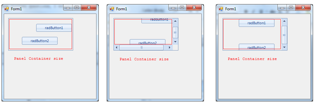 this.radScrollablePanel1.AutoScroll = true;But this enables both Horizontal and Vertical Scrollbars when it is necessary (because when one Scrollbar is shown, the visible area gets smaller, so the other Scrollbar is shown too). Currently, RadScrollablePanel does not support the feature to hide one of the Scrollbars if the visible area is not enough for the content.