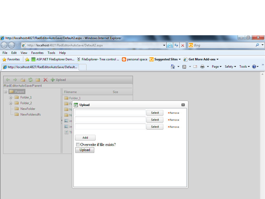 <telerik:RadFileExplorer ID="FileExplorer1" runat="server" Height="300px" Width="804px" Skin="Telerik"> <Configuration SearchPatterns="*.*" UploadPaths="~/images/" ViewPaths="~/images/" DeletePaths="~/images/"></Configuration></telerik:RadFileExplorer><script type="text/javascript"> function OnToolBarButtonClicked(oToolbar, args) { var toolbarItem = args.get_item(); if (toolbarItem.get_value() == "Upload") {// upload is clicked var uploadContainerID = "<%= FileExplorer1.ClientID %>_uploadContainer"; var uploadContainer = $telerik.$("#" + uploadContainerID).get(0); // Find the uplaod RadWindow's UploadContainer var fileExplorerClientId = "<%= FileExplorer1.ClientID %>"; // the client id of the RadFileExplorer var infoPanel = $telerik.$(".rfeUploadInfoPanel", uploadContainer); // Find the upload info infoPanel.css("display", "none"); // hide it } }</script>Default.aspx.cs: