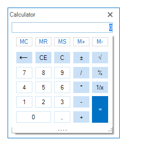 Public Class CustomCalculatorElement Inherits LightVisualElement Private calculatorElement As RadCalculatorDropDownElement Private contentElement As RadCalculatorContentElement Private hostedTextBox As TextBox Protected Overrides Sub CreateChildElements() MyBase.CreateChildElements() calculatorElement = New RadCalculatorDropDownElement() hostedTextBox = TryCast(calculatorElement.EditorContentElement.TextBoxItem.HostedControl, TextBox) AddHandler hostedTextBox.MouseUp, AddressOf hostedTextBox_MouseUp Me.Children.Add(calculatorElement) calculatorElement.ArrowButton.Visibility = ElementVisibility.Collapsed calculatorElement.MinSize = New System.Drawing.Size(0, 30) contentElement = calculatorElement.CalculatorContentElement Me.Children.Add(calculatorElement.CalculatorContentElement) End Sub Private Sub hostedTextBox_MouseUp(sender As Object, e As MouseEventArgs) 'this allows selecting text from the editable area so you can copy paste it If hostedTextBox.SelectionLength = 0 Then Me.contentElement.Focus() End If End Sub Protected Overrides Function MeasureOverride(availableSize As SizeF) As SizeF Dim res As SizeF = MyBase.MeasureOverride(availableSize) Me.contentElement.Measure(New SizeF(availableSize.Width, availableSize.Height - calculatorElement.DesiredSize.Height)) Return res End Function Protected Overrides Function ArrangeOverride(finalSize As SizeF) As SizeF MyBase.ArrangeOverride(finalSize) Me.calculatorElement.Arrange(New RectangleF(0, 0, finalSize.Width, calculatorElement.DesiredSize.Height)) Me.contentElement.Arrange(New RectangleF(0, calculatorElement.DesiredSize.Height, finalSize.Width, finalSize.Height - calculatorElement.DesiredSize.Height)) Return finalSize End FunctionEnd ClassI hope this information is useful.