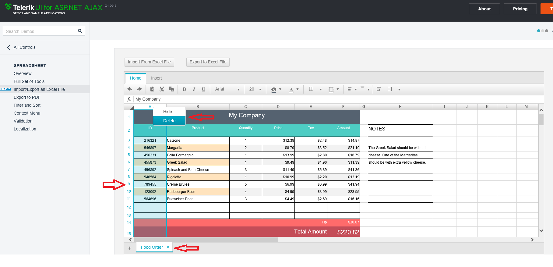 <telerik:RadSpreadsheet runat="server" ID="RadSpreadsheet1"> <ContextMenus> <RowHeaderContextMenu OnClientItemClicking="OnClientItemClicking"> </RowHeaderContextMenu> <ColumnHeaderContextMenu OnClientItemClicking="OnClientItemClicking"> </ColumnHeaderContextMenu> </ContextMenus></telerik:RadSpreadsheet>function OnClientItemClicking(sender, eventArgs) { var selectedItemValue = eventArgs.get_item().get_value(); if (selectedItemValue === "CommandDeleteRow" || selectedItemValue === "CommandDeleteColumn") { eventArgs.set_cancel(true); }}3. Dragging to resize a column is supported.
