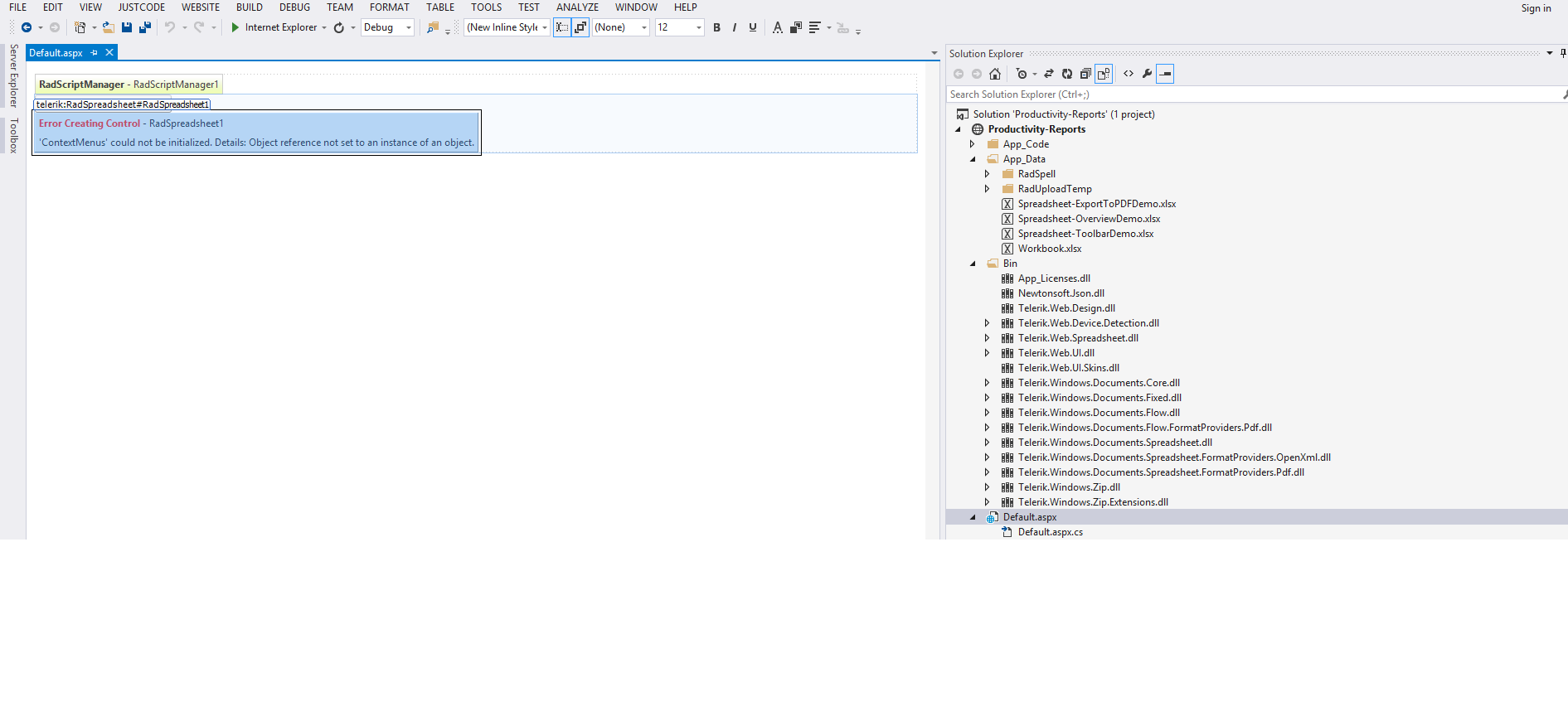 using System;using System.Collections.Generic;using System.Linq;using System.Web;using System.Web.UI;using System.Web.UI.WebControls;using Telerik.Web.UI;public partial class _Default : System.Web.UI.Page{ private const string ProviderSessionKey = "Telerik.Web.Examples.SpreadSheet.ContextMenu.DefaultCS"; protected void Page_Init(object sender, EventArgs e) { SpreadsheetDocumentProvider provider; if ((Session[ProviderSessionKey] == null) || (!IsPostBack)) { provider = new SpreadsheetDocumentProvider(Server.MapPath("~/App_Data/Spreadsheet-ToolbarDemo.xlsx")); Session[ProviderSessionKey] = provider; } else { provider = (SpreadsheetDocumentProvider)Session[ProviderSessionKey]; } RadSpreadsheet1.Provider = provider; }}We can confirm that the error in the Designer when ContextMenus are declared is a bug. We logged it and will fix it in one of our next releases.