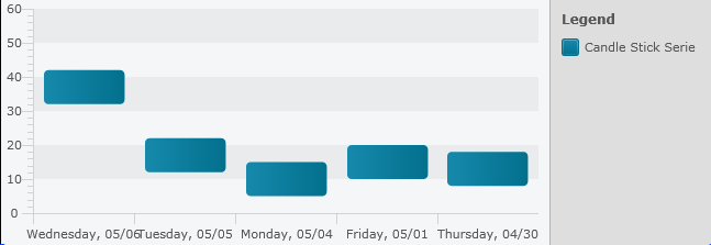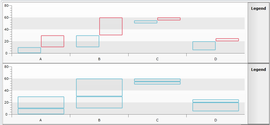 <my:RadChart Height="200"> <my:RadChart.DefaultView> <Charting:ChartDefaultView> <Charting:ChartDefaultView.ChartArea> <Charting:ChartArea> <Charting:ChartArea.DataSeries> <!-- Candle Stick 1 --> <Charting:DataSeries LegendLabel="Product Sales"> <Charting:DataSeries.Definition> <Charting:CandleStickSeriesDefinition> </Charting:CandleStickSeriesDefinition> </Charting:DataSeries.Definition> <Charting:DataPoint Open="0" Low="0" Close="10" High="10" XCategory="A"/> <Charting:DataPoint Open="10" Low="10" Close="30" High="30" XCategory="B"/> <Charting:DataPoint Open="50" Low="50" Close="55" High="55" XCategory="C"/> <Charting:DataPoint Open="5" Low="5" Close="20" High="20" XCategory="D"/> </Charting:DataSeries> <!-- Candle Stick 2 --> <Charting:DataSeries LegendLabel="Product Sales"> <Charting:DataSeries.Definition> <Charting:CandleStickSeriesDefinition> </Charting:CandleStickSeriesDefinition> </Charting:DataSeries.Definition> <Charting:DataPoint Open="10" Low="10" Close="30" High="30" XCategory="A"/> <Charting:DataPoint Open="30" Low="30" Close="60" High="60" XCategory="B"/> <Charting:DataPoint Open="55" Low="55" Close="60" High="60" XCategory="C"/> <Charting:DataPoint Open="20" Low="20" Close="25" High="25" XCategory="D"/> </Charting:DataSeries> </Charting:ChartArea.DataSeries> </Charting:ChartArea> </Charting:ChartDefaultView.ChartArea> </Charting:ChartDefaultView> </my:RadChart.DefaultView> </my:RadChart> <my:RadChart Height="200"> <my:RadChart.DefaultView> <Charting:ChartDefaultView> <Charting:ChartDefaultView.ChartArea> <Charting:ChartArea> <Charting:ChartArea.DataSeries> <!-- Candle Stick --> <Charting:DataSeries LegendLabel="Product Sales"> <Charting:DataSeries.Definition> <Charting:CandleStickSeriesDefinition> </Charting:CandleStickSeriesDefinition> </Charting:DataSeries.Definition> <!-- Data 1 --> <Charting:DataPoint Open="0" Low="0" Close="10" High="10" XCategory="A"/> <Charting:DataPoint Open="10" Low="10" Close="30" High="30" XCategory="B"/> <Charting:DataPoint Open="50" Low="50" Close="55" High="55" XCategory="C"/> <Charting:DataPoint Open="5" Low="5" Close="20" High="20" XCategory="D"/> <!-- Data 2 --> <Charting:DataPoint Open="10" Low="10" Close="30" High="30" XCategory="A"/> <Charting:DataPoint Open="30" Low="30" Close="60" High="60" XCategory="B"/> <Charting:DataPoint Open="55" Low="55" Close="60" High="60" XCategory="C"/> <Charting:DataPoint Open="20" Low="20" Close="25" High="25" XCategory="D"/> </Charting:DataSeries> </Charting:ChartArea.DataSeries> </Charting:ChartArea> </Charting:ChartDefaultView.ChartArea> </Charting:ChartDefaultView> </my:RadChart.DefaultView> </my:RadChart>First charts shows bars next to each other, second shows one over another but with same color. Try to solve it by using MVVM approach.