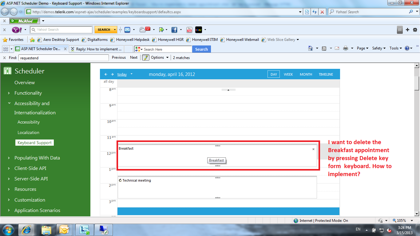 How to implement to delete an appointment when 'del' key is pressed from keyboard. From the radScheduler demo i can delete the appointment by press 'Del' key from keyboard. But I do not know how to easily enable this fuction for radScheduler (asp.net) control? Can you give me a simple example? thanks.