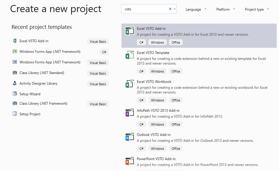 Hi,you can Creat New project vsto for excel addin and you will see the problem I have stated