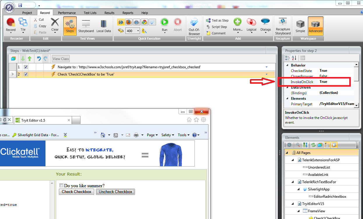 Also, I'm not completely sure but there might be a jQuery event attached to the CheckBox. Test Studio is checking the box through the UI during execution, but it won't automatically process the jQuery event. If that's the case, here is an article explaining how to overcome the problem with a coded step.