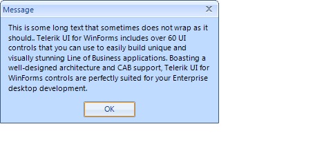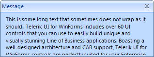 RadMessageBox.Instance.Controls["radLabel1"].MaximumSize = new System.Drawing.Size(300, 500);I attached an image and sample project which demonstrates you the message box.