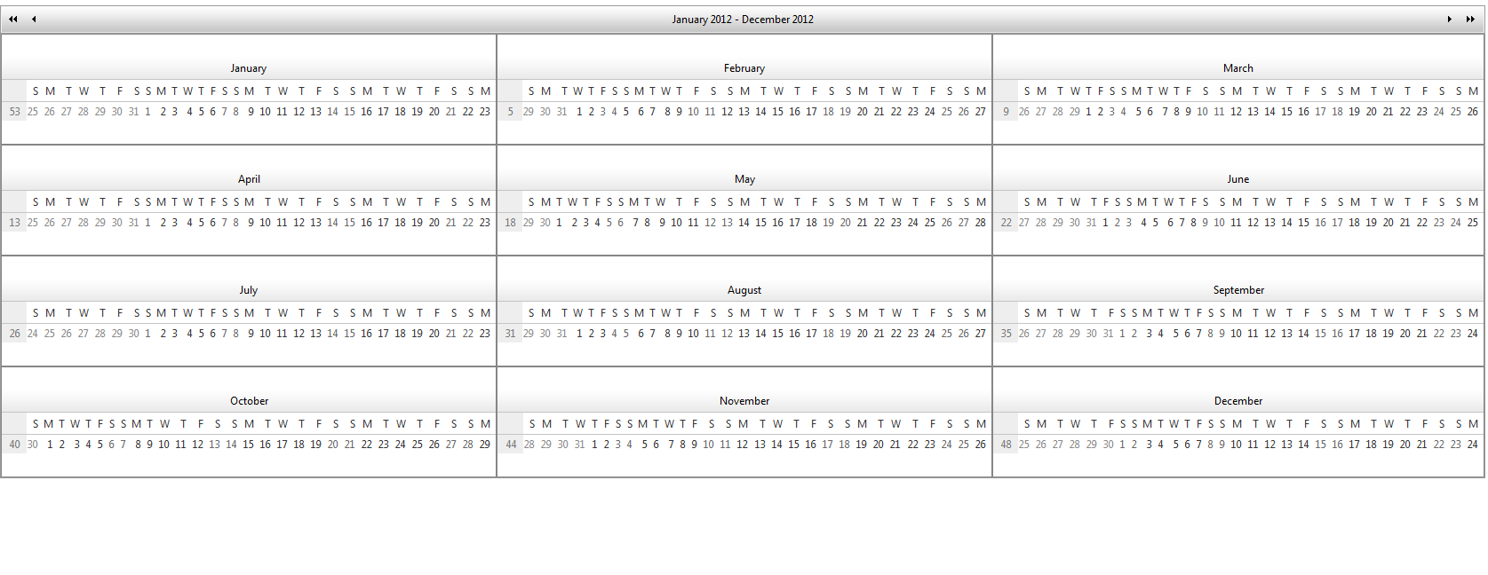 SingleViewRows="1" MultiViewRows="4" MultiViewColumns="3" FocusedDate="1/1/2012 12:00:00 AM"