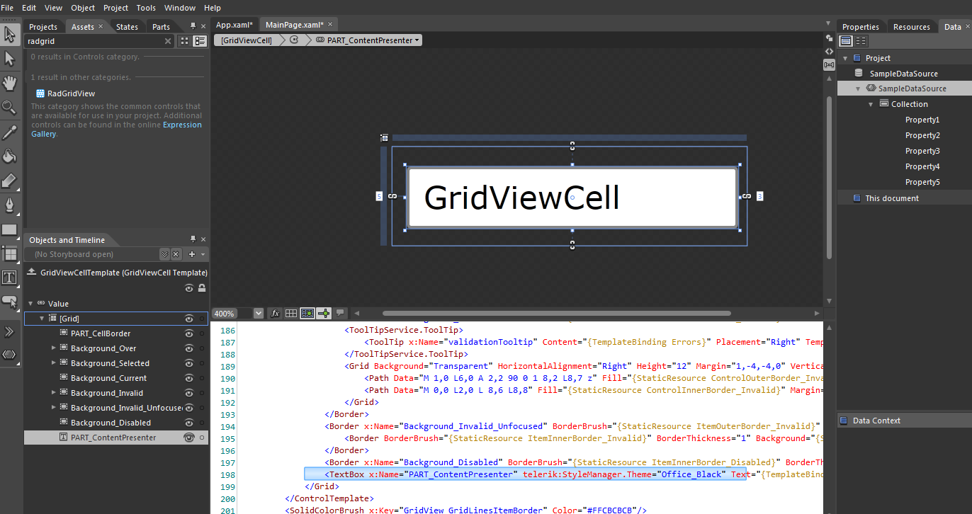 <telerik:GridViewDataColumn Header="Author" DataMemberBinding="{Binding DisplayName, Mode=OneWay}" > <telerik:GridViewDataColumn.CellTemplate> <DataTemplate> <TextBox Text="{Binding DisplayName}" Style="{StaticResource TextBoxStyle1}"></TextBox> </DataTemplate> </telerik:GridViewDataColumn.CellTemplate></telerik:GridViewDataColumn>And here is the style: