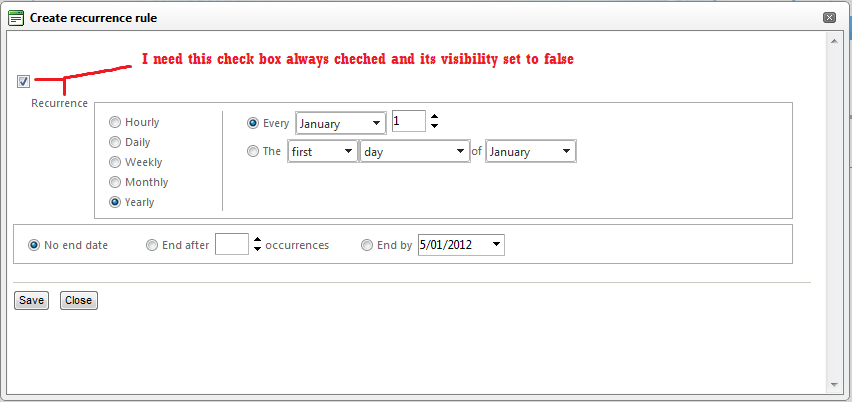 I am trying to create a custom scheduler modules for our application, I only want to user the RadSchedulerRecurrenceEditor as you can see in the following code snippet and the image provided. I need to make sure that the Recurrence check box is always checked and its visibility is set to hidden, however I have not been able to come up with a solution to this issue yet. Would you please help me with this issue as I need to get started on this development soon.