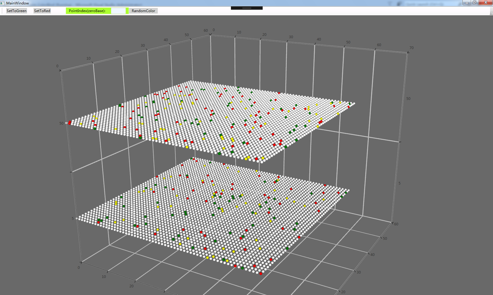 using System;using System.Windows;namespace Large3DPoint_ColorBind{ public partial class MainWindow : Window { ViewModel vm; System.Timers.Timer timer; Random ra = new Random(); public MainWindow() { InitializeComponent(); vm = new ViewModel(); this.DataContext = vm; } private void ButtonGreen_Click(object sender, RoutedEventArgs e) { int iIndex = -1; if(int.TryParse(pointIndex.Text.ToString(), out iIndex) == true) { SetPointWithColor(iIndex, "green"); } } private void ButtonRed_Click(object sender, RoutedEventArgs e) { int iIndex = -1; if (int.TryParse(pointIndex.Text.ToString(), out iIndex) == true) { SetPointWithColor(iIndex, "red"); } } public void SetPointWithColor(int iIndex, string sColor) { if ((iIndex >= 0) && (iIndex < vm.SourceData.Count)) { vm.SourceData[iIndex].ColorFlag = sColor; //triger the redraw event vm.RedrawFlag = ""; } else { MessageBox.Show("Out of range!"); } } private void buttonRandom_Click(object sender, RoutedEventArgs e) { timer = new System.Timers.Timer() { }; timer.Interval = 100; timer.Elapsed += Timer_Elapsed; timer.Enabled = true; } private void Timer_Elapsed(object sender, System.Timers.ElapsedEventArgs e) { //throw new NotImplementedException int iColor = ra.Next(0, 100); string sColor = "yellow"; if (iColor%3 == 0) { sColor = "green"; } else if (iColor % 3 == 1) { sColor = "red"; } else { sColor = "yellow"; } int iIndex = ra.Next(0, vm.SourceData.Count); SetPointWithColor(iIndex, sColor); } }}