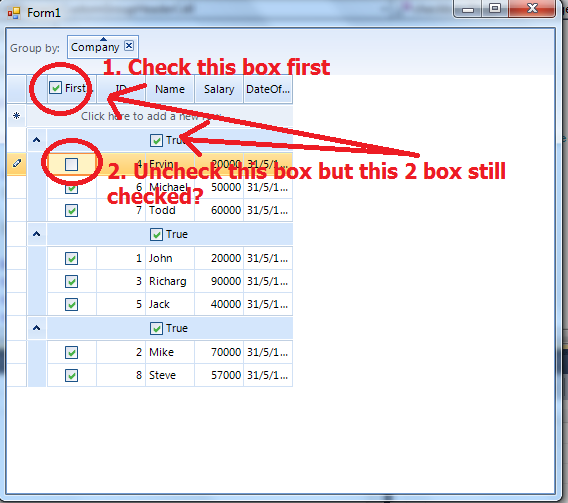 Note: If you hide all the in ValueChanged, you can see customCell_MeCheckChanged is working perfectly on CustomGroupHeaderCell.