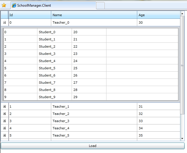 NOTE: Because I must retrieve data from web service when I click the "+" to expand a Teacher row, so, I cannot use RadTreeListView.