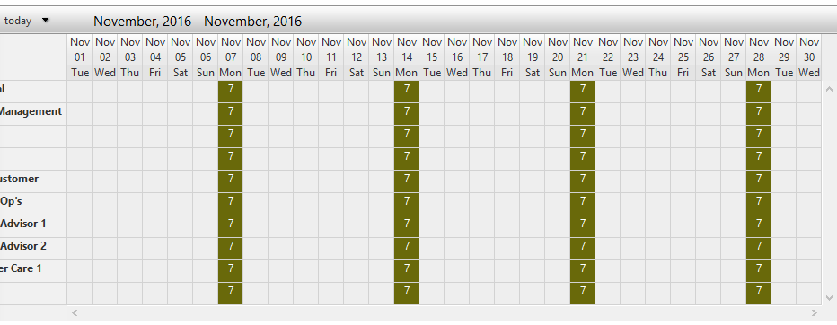 using System;using System.Data;using System.Configuration;using System.Web;using System.Web.Security;using System.Web.UI;using System.Web.UI.WebControls;using System.Web.UI.WebControls.WebParts;using System.Web.UI.HtmlControls;using Telerik.Web.UI;using Telerik.Web.UI.Calendar;using Telerik.Web.UI.Calendar.View;public partial class RadSchedulerWebForm : System.Web.UI.Page { protected override void OnInit(EventArgs e) { base.OnInit(e); RadScheduler1.Provider = new XmlSchedulerProvider(Server.MapPath("~/App_Data/Appointments.xml"), true); } protected void Page_Load(object sender, EventArgs e) { if (!IsPostBack & RadScheduler1.SelectedView == SchedulerViewType.TimelineView) { int year = RadScheduler1.SelectedDate.Year; int month = RadScheduler1.SelectedDate.Month; int numberOfDaysInCurrentMonth = DateTime.DaysInMonth(year, month); RadScheduler1.SelectedDate = new DateTime(year, month, 1); RadScheduler1.TimelineView.NumberOfSlots = numberOfDaysInCurrentMonth; } } protected void RadScheduler1_NavigationComplete(object sender, SchedulerNavigationCompleteEventArgs e) { if (RadScheduler1.SelectedView == SchedulerViewType.TimelineView) { int year = RadScheduler1.SelectedDate.Year; int month = RadScheduler1.SelectedDate.Month; int numberOfDaysInCurrentMonth = DateTime.DaysInMonth(year, month); RadScheduler1.SelectedDate = new DateTime(year, month, 1); RadScheduler1.TimelineView.NumberOfSlots = numberOfDaysInCurrentMonth; } } protected void RadScheduler1_TimeSlotCreated(object sender, Telerik.Web.UI.TimeSlotCreatedEventArgs e) { if (RadScheduler1.SelectedView == SchedulerViewType.TimelineView) { if (e.TimeSlot.Start.Date.DayOfWeek == DayOfWeek.Monday) { Label numberLabel = new Label(); numberLabel.Text = "7"; e.TimeSlot.CssClass = "MySlotGreen"; e.TimeSlot.Control.Controls.Add(numberLabel); } } } }