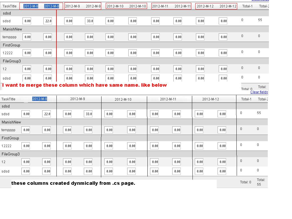 I am creating a radgrid dynamically and in that grid i have two columns whit same name and now i want to merge that column in one column and i want to merge cells as well.