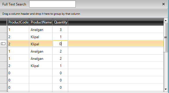 <telerik:RadGridView Grid.Row="2" Grid.ColumnSpan="3" x:Name="gridview" ItemsSource="{Binding CurrentDetailBLLs}" SelectedItem="{Binding SelectedCurrentDetailBLL,Mode=TwoWay}" SelectionMode="Extended" CanUserDeleteRows="True" CanUserInsertRows="True" IsReadOnly="False" IsFilteringAllowed="False" AutoGenerateColumns="False" GroupRenderMode="Flat" AutoExpandGroups="True" NewRowPosition="None" IsSynchronizedWithCurrentItem="True" KeyUp="dataGridView1_KeyUp"> <!--SelectionUnit="FullRow"--> <telerik:RadGridView.Columns> <telerik:GridViewDataColumn TextAlignment="Justify" Width="auto" HeaderTextAlignment="Center" DataMemberBinding="{Binding Path=ProductID}" Header="ProductCode" /> <telerik:GridViewDataColumn TextAlignment="Justify" Width="auto" HeaderTextAlignment="Center" DataMemberBinding="{Binding Path=ProductName}" Header="ProductName" IsReadOnly="True"> </telerik:GridViewDataColumn> <telerik:GridViewDataColumn TextAlignment="Center" Width="auto" HeaderTextAlignment="Center" DataMemberBinding="{Binding Path=Quantity}" Header="Quantity"/> </telerik:RadGridView.Columns>the attached image make clear what i am talking about .