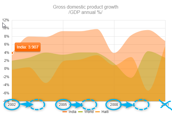 Another way to move the labels to the middle of major units is to set justified: false for the categoryAxis. However, this will also make the series start and end at the middle of major units. Here, you can see the result: