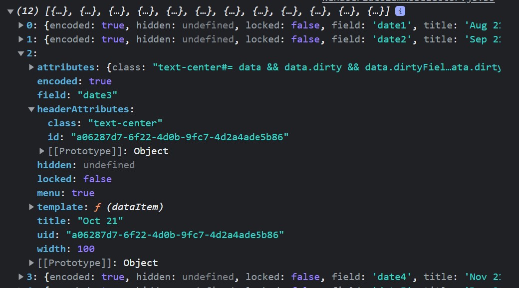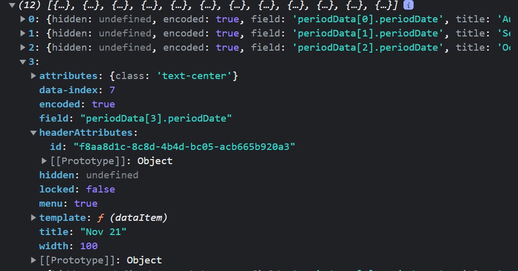 In troubleshooting, I noticed that grid.columns is not returning headerAttributes.class for the treelist when calling $("#myGrid).data("kendoTreeList").columns for the tree list but it is when calling $("myGrid).data("kendoGrid").columns for the grid. I'm attaching images from my own project of the two returns (Note that they are from different instances which is why the other data is not the same in the two screenshots nor do they go with the dojo.)
