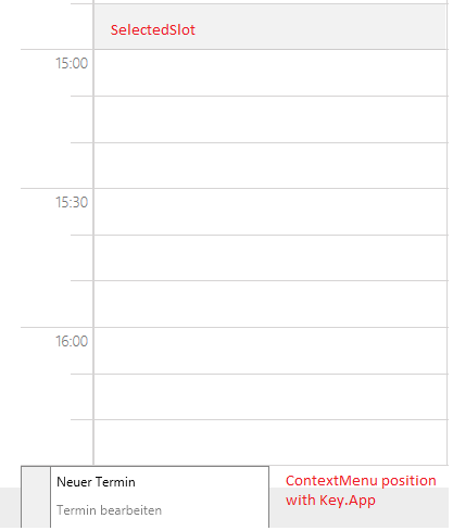 I'm trying to get the RadContextMenu attached to the RadScheduleView to open at the currently selected slot, appointment or empty field using the Apps key (a.k.a. keyboard rightclick).