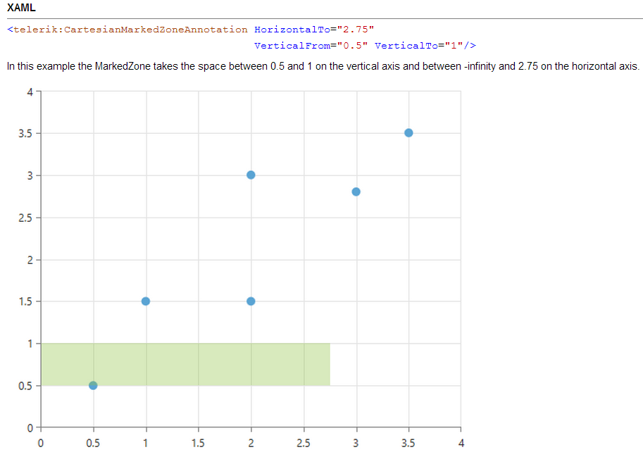 <telerik:RadCartesianChart x:Name="chart"> <telerik:RadCartesianChart.VerticalAxis> <telerik:LinearAxis/> </telerik:RadCartesianChart.VerticalAxis> <telerik:RadCartesianChart.HorizontalAxis> <telerik:CategoricalAxis IsInverse="True"/> </telerik:RadCartesianChart.HorizontalAxis> <telerik:RadCartesianChart.Annotations> <telerik:CartesianMarkedZoneAnnotation HorizontalTo="2.75" VerticalFrom="0.5" VerticalTo="1"/> </telerik:RadCartesianChart.Annotations></telerik:RadCartesianChart>Shouldnt the above code plot the same marked zone annotation as on the image(taken from telerik homepage) i have attached?