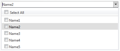 <telerik:RadComboBox ID="RadComboBoxWithCheckbox" runat="server" EmptyMessage="--Select Name--" HighlightTemplatedItems="true" AllowCustomText="true" Width="400px"> <HeaderTemplate> <asp:CheckBox ID="chkSelectAll" runat="server" onClick="HeaderCheckChanged(this,'RadComboBoxWithCheckbox');" /> <asp:Label runat="server" ID="lblClassSelectAll" Text="Select All" AssociatedControlID="chkSelectAll"></asp:Label> </HeaderTemplate> <ItemTemplate> <div onclick="StopPropagation(event)"> <asp:CheckBox runat="server" ID="chkddlID" onclick="onCheckBoxClick(this,'RadComboBoxWithCheckbox')" Text='<%#Eval("Name") %>' /> <asp:Label runat="server" ID="labelddlID" Text='<%#Eval("ID") %>' Visible="false"></asp:Label> </div> </ItemTemplate> </telerik:RadComboBox><telerik:RadCodeBlock ID="RadCodeBlock1" runat="server"> <script type="text/javascript"> function HeaderCheckChanged(chkbx, combo) { var headerchk = chkbx.checked; combo = $find("<%= RadComboBoxWithCheckbox.ClientID %>"); cancelDropDownClosing = true; //holds the text of all checked items var text = ""; //holds the values of all checked items var values = ""; //get the collection of all items //enumerate all items var items = combo.get_items(); for (var i = 0; i < items.get_count(); i++) { var item = items.getItem(i); //get the checkbox element of the current item var chk1 = $get(combo.get_id() + "_i" + i + "_chkddlID"); chk1.checked = headerchk; if (chk1.checked) { text += item.get_text() + ", "; values += item.get_value() + ","; } } //remove the last comma from the string text = removeLastComma(text); values = removeLastComma(values); if (text.length > 0) { //set the text of the combobox combo.set_text(text); } else { //all checkboxes are unchecked //so reset the controls combo.set_text(""); } } function onCheckBoxClick(chk, combo) { combo = $find("<%= RadComboBoxWithCheckbox.ClientID %>"); cancelDropDownClosing = true; var text = ""; var values = ""; var items = combo.get_items(); for (var i = 0; i < items.get_count(); i++) { var item = items.getItem(i); var chk1 = $get(combo.get_id() + "_i" + i + "_chkddlID"); if (chk1.checked) { text += item.get_text() + ", "; values += item.get_value() + ","; } } text = removeLastComma(text); values = removeLastComma(values); if (text.length > 0) { combo.set_text(text); } else { combo.set_text(""); } } function removeLastComma(str) { return str.slice(0, -1); } function StopPropagation(e) { e.cancelBubble = true; if (e.stopPropagation) { e.stopPropagation(); } } </script> </telerik:RadCodeBlock>protected void Page_Load(object sender, EventArgs e) { if (!IsPostBack) { dynamic data = new[] { new { ID = 1, Name ="Name1"}, new { ID = 2, Name = "Name2"}, new { ID = 3, Name = "Name3"}, new { ID = 4, Name = "Name4"}, new { ID = 5, Name = "Name5"} }; RadComboBoxWithCheckbox.DataSource = data; RadComboBoxWithCheckbox.DataTextField = "Name"; RadComboBoxWithCheckbox.DataValueField = "ID"; RadComboBoxWithCheckbox.DataBind(); } }let me know if any concern.