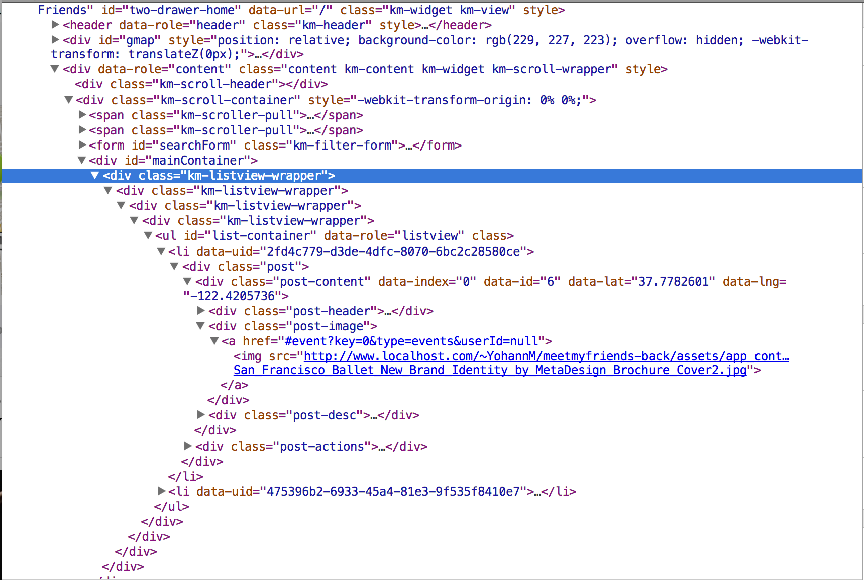 $.when( User.getUsersNearby( position.coords.latitude, position.coords.longitude, Usr_radius, Usr_limit, Usr_offset ) ).done( function( response ) { var template = Handlebars.compile( $( '#userListTemplate' ).html() ); $("#list-container").kendoMobileListView({ template : template, dataSource: kendo.data.DataSource.create( results ) });});And I can see the results I want to be display in the listview. But I've noticed 2 things: