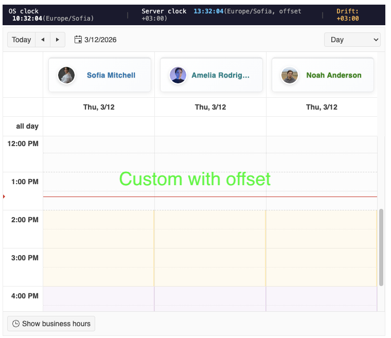 The issue is that Kendo UI internally relies on the browser's native new Date() and Date.now() to determine the current time. Because of this, the Scheduler has no way to know about our application's synchronized time.