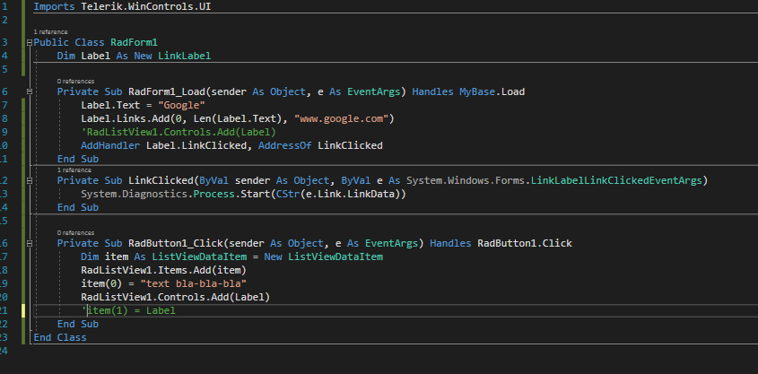 I really need some support for the following problem: I want to add into a radListView cell (located in column no.2/from 3 let's say) a LinkLabel or some text acting as a hyperlink. (I have attached a small capture for my first try, but the code add the label in the first position of the ListView item - see the second capture)