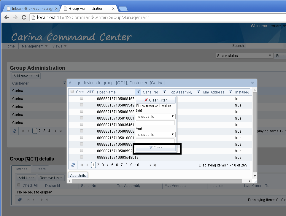 What I am needing to do is register for the click event for the filter button that is clicked on to apply the filters the user chooses. This is the button that appears in the popup where the user chooses the filters. This is the button that when clicked on causes the server's action method for the Select event to be called.The attached photo shows the filter button I am talking about.