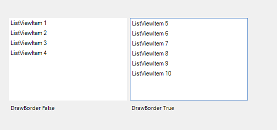You need to set the DrawBorder property of the ListViewElement to false in order to hide the control border. Please take a look at the following code example: