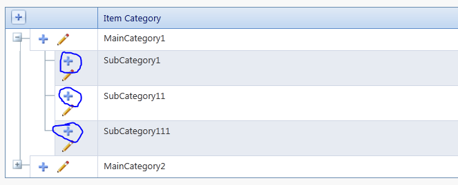 protected void RadTreeList1_ItemDataBound(object sender, TreeListItemDataBoundEventArgs e){ if (e.Item is TreeListDataItem) { var dataItem = (TreeListDataItem)e.Item; if (dataItem.HierarchyIndex.NestedLevel != 0) { //specify your edit column's UniqueName here dataItem["EditCommandColumn"].Controls[0].Visible = false; } }}Alternatively, if you have more than 2 levels of hierarchy and want to hide the add button for leaf nodes only, you can take a different approach: