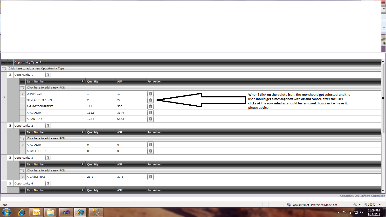 2) upon clicking the messagebox button (Ok), the row should be deleted from childgrid. I have implemented the messagebox. now upon clicking it should delete the row from the childgrid?