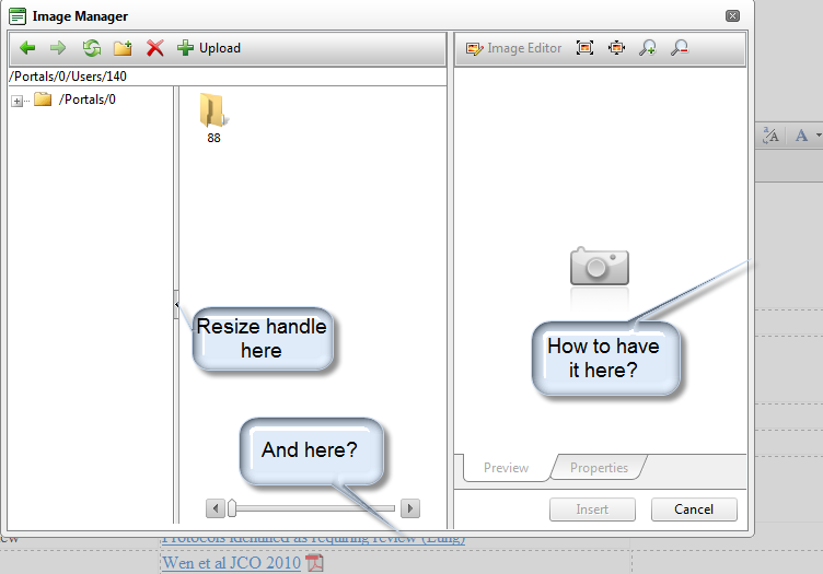 We have upgraded to telerik RadEditor and client is unhappy about inability to resize middle panel in Image Manager so that they can see more folder/file icons. There is a handle that allows to drag a separator between folder tree and middle panel but they want to be able to drag everything, including control borders to increase control size (see screenshot). Is there a config setting or something that allows to do this?