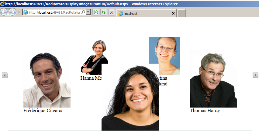<telerik:RadRotator ID="RadRotator1" runat="server" Width="810px" ItemWidth="300" Height="350px" ItemHeight="220" ScrollDuration="500" FrameDuration="2000" PauseOnMouseOver="false" RotatorType="CarouselButtons" OnClientItemClicked="OnClientItemClicked"> <ItemTemplate> <telerik:RadBinaryImage ID="Image1" runat="server" DataValue='<%# Eval("ImageColumn") %>' /> </ItemTemplate> </telerik:RadRotator> I hope that helps.