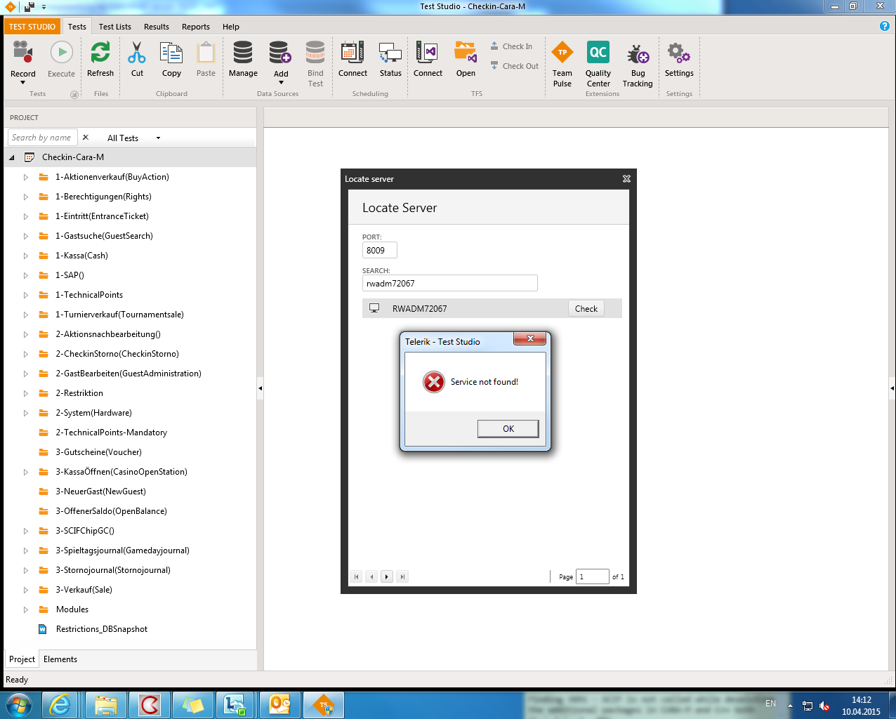 Now i try to access my machine B through run test lists remotely option in machine A. But when ever I click on check button next to machine name option in run lists remotely, it throws an error message as "Service not found". Also attached the screenshot for the same.